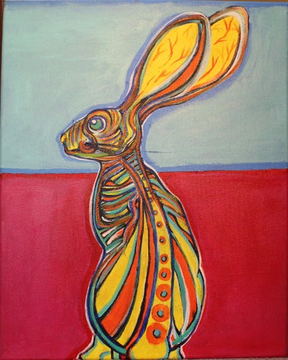 First piece in the Rabbit series. The name comes from the novel 'Watership Down' by Richard Adams. Most of this painting was painted live at an art even.